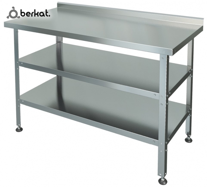 Столы производственные с полкой и бортом серии «Стандарт» предназначены для разделки продуктов питания перед их кулинарной обработкой на предприятиях общественного питания. Также столы могут использоваться для установки некоторых видов технологического оборудования. Металлическая столешница изготовлена из нержавеющей стали марки AISI 430 толщиной в 0,8 мм и установлена на разборный каркас со сплошной полкой, выполненный из оцинкованного уголка толщиной в 1,5 мм. Столешница усилена доской из ЛДСП и имеет борт высотой в 35 мм. Столешница выдерживает распределённую нагрузку в 100 кг на всю столешницу. Полка рассчитана на распределённую нагрузку не более 50 кг. Подходят для: • кафе и ресторанов